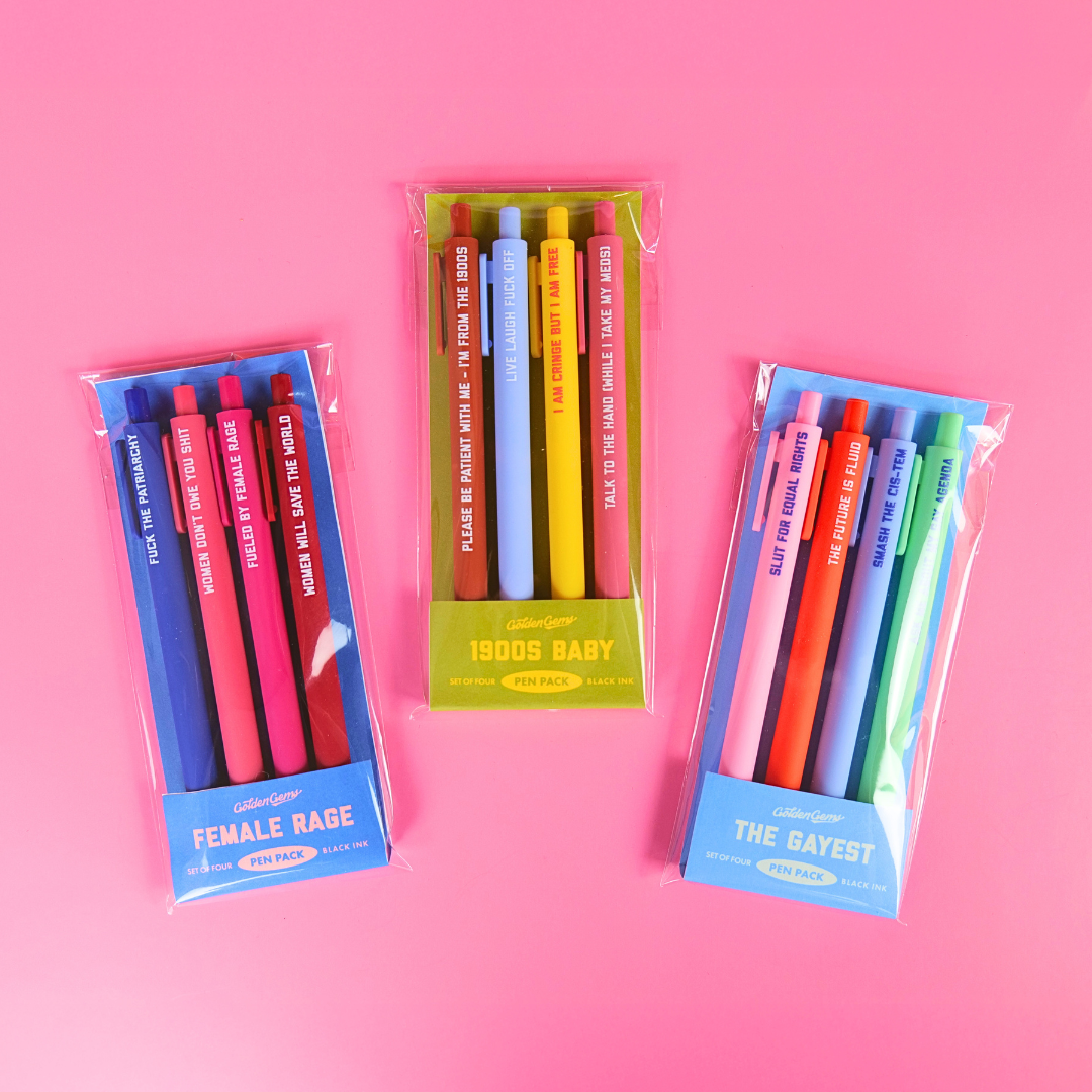 Put your thoughts on paper — or your grocery list, rage journal, or love note to yourself — with this 4-pack of smooth black ink pens. Each one comes stamped with a funny little reminder that life’s too short to take too seriously. Cute, bold, and ready to make your desk a little more fun.