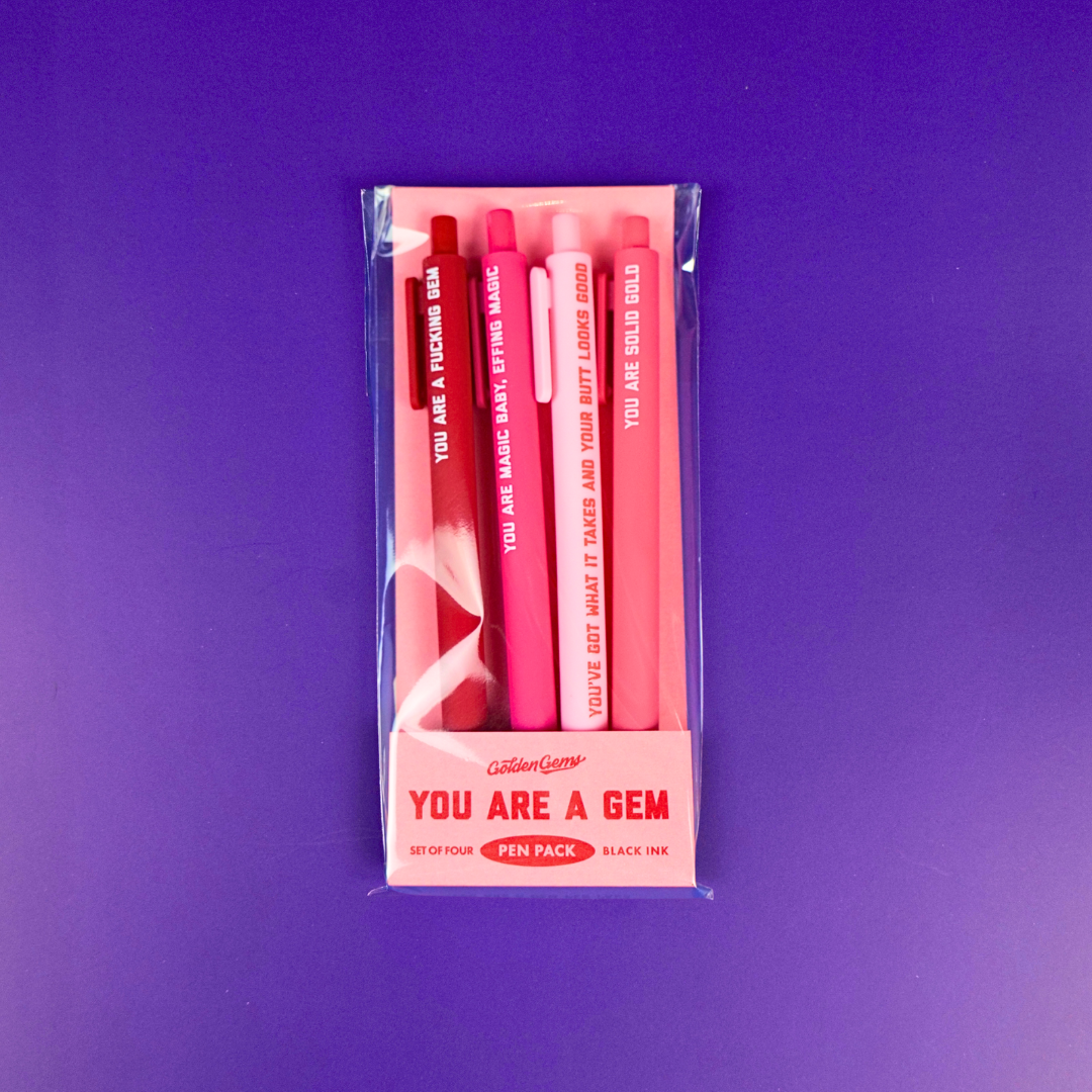 Put your thoughts on paper — or your grocery list, rage journal, or love note to yourself — with this 4-pack of smooth black ink pens. Each one comes stamped with a funny little reminder that life’s too short to take too seriously. Cute, bold, and ready to make your desk a little more fun.